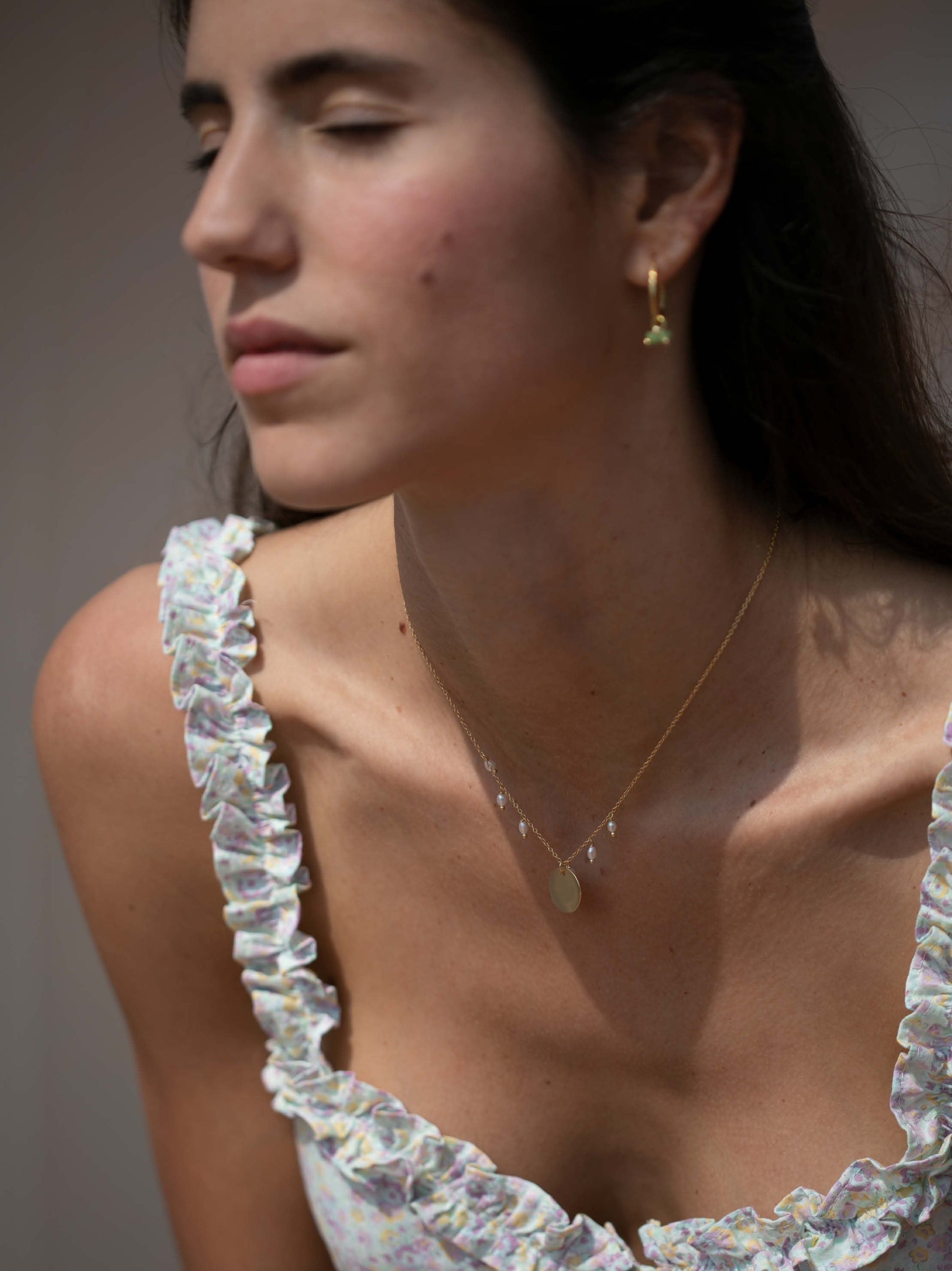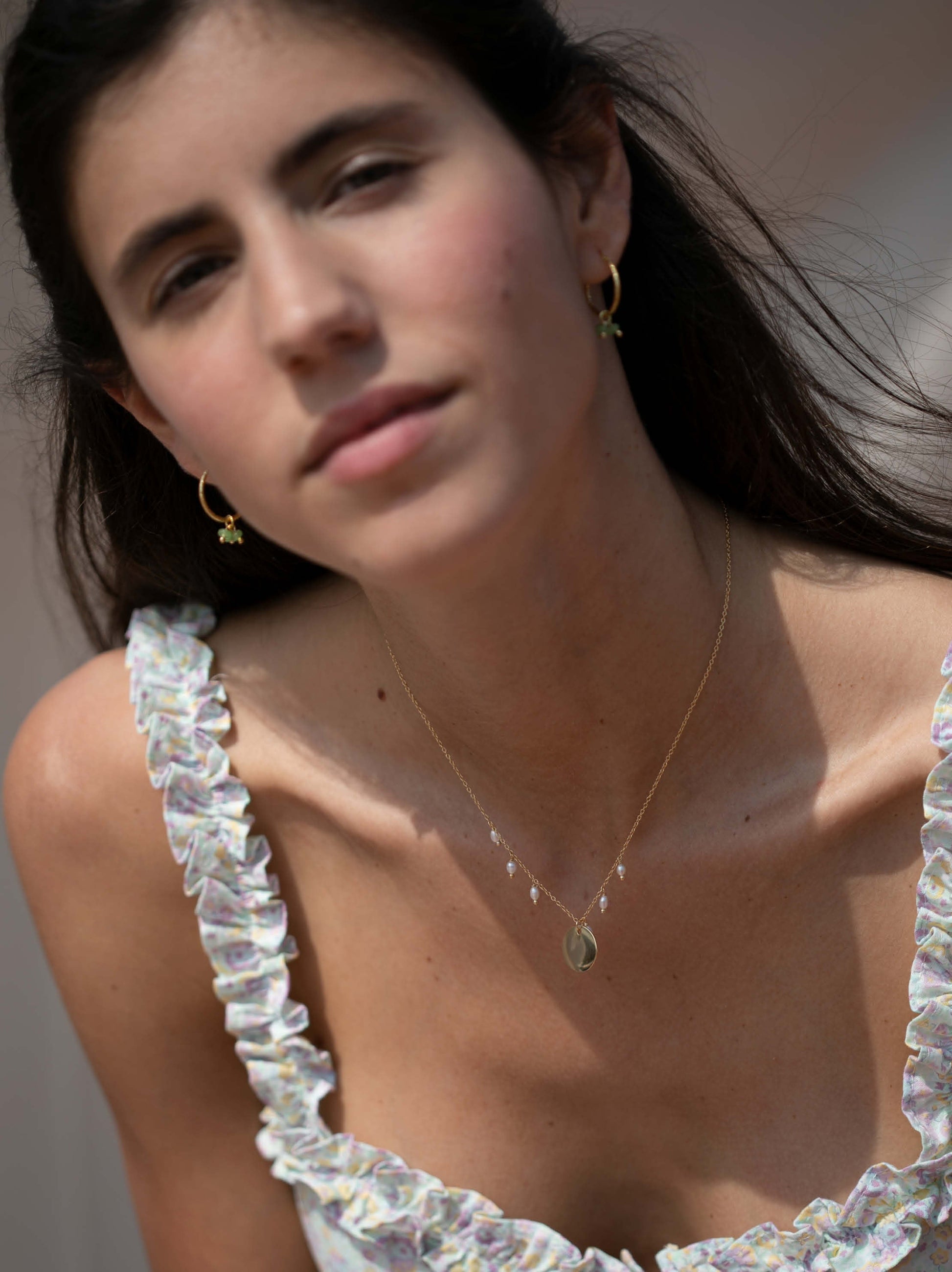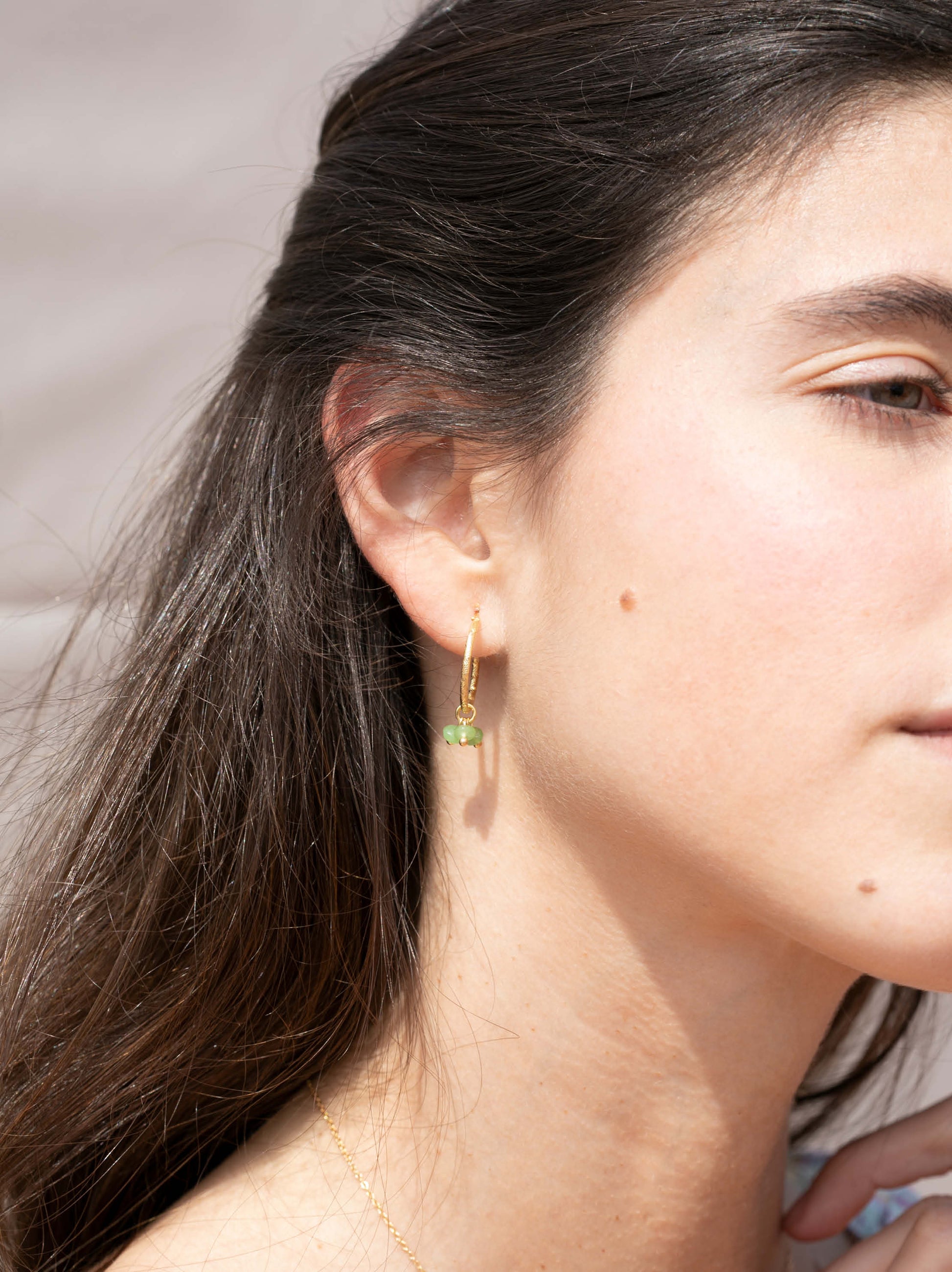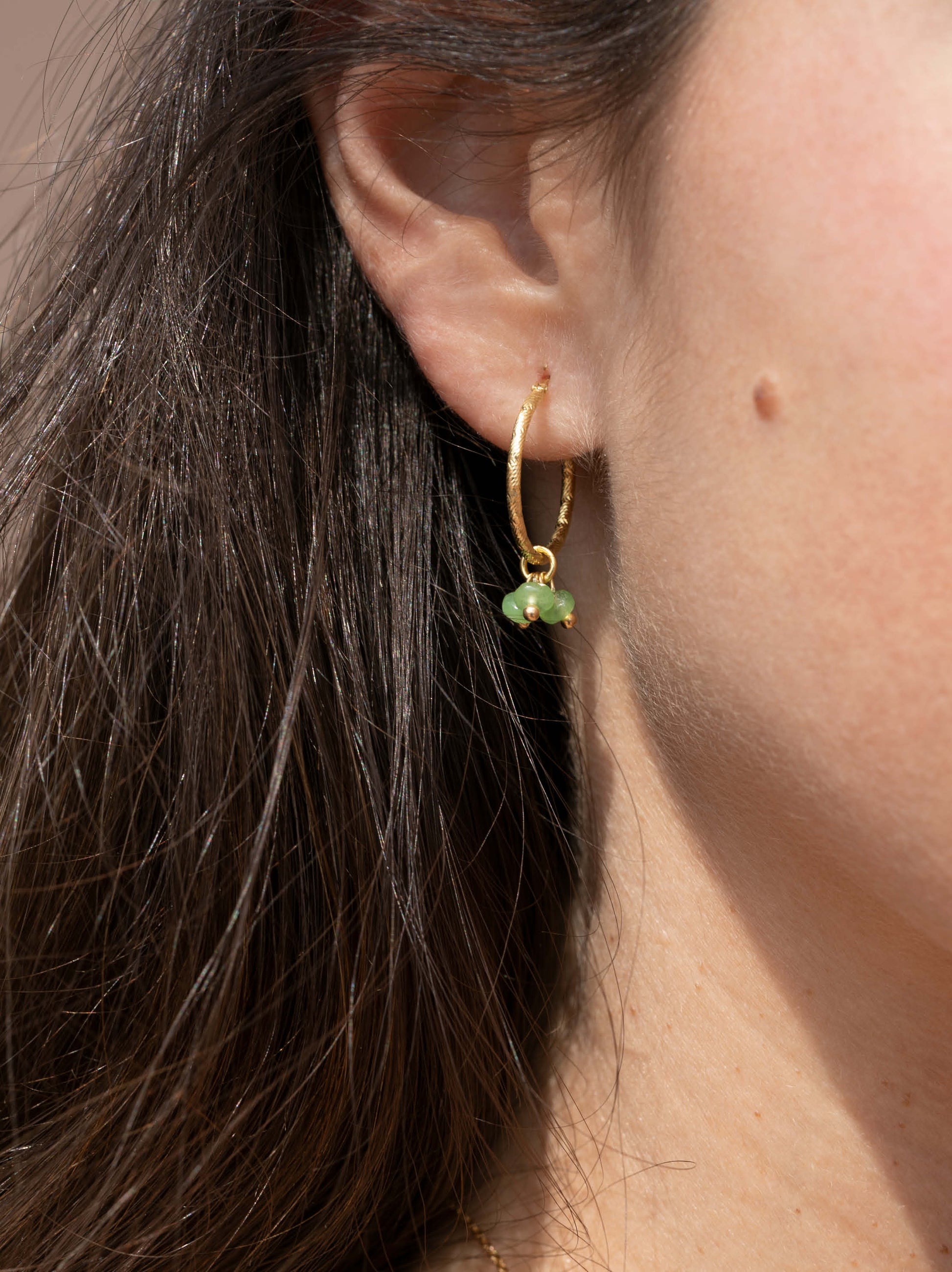 Meet PHOEBE a versatile, elegant and feminine piece. Made with a textured shiny gold hoop embellished with three delicate light green agate stones. They are so comfortable and lightweight you will want to take them forever with you!
