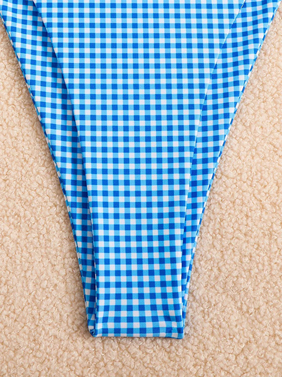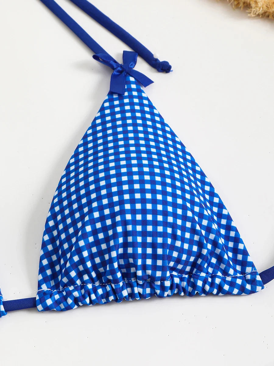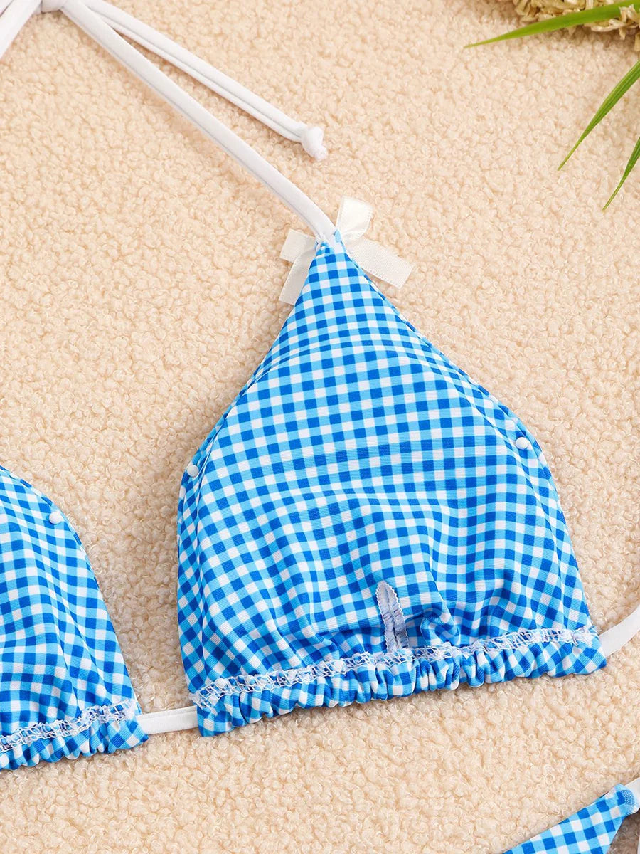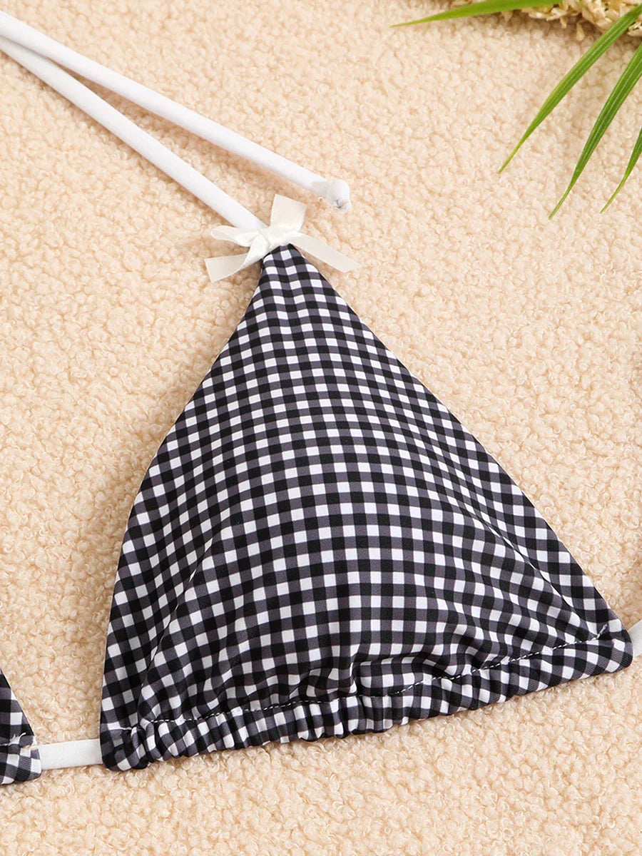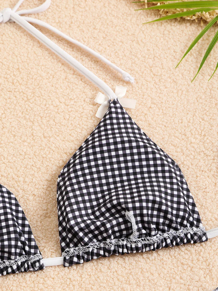 Checkered Halterneck Bikini with Butterfly Decoration