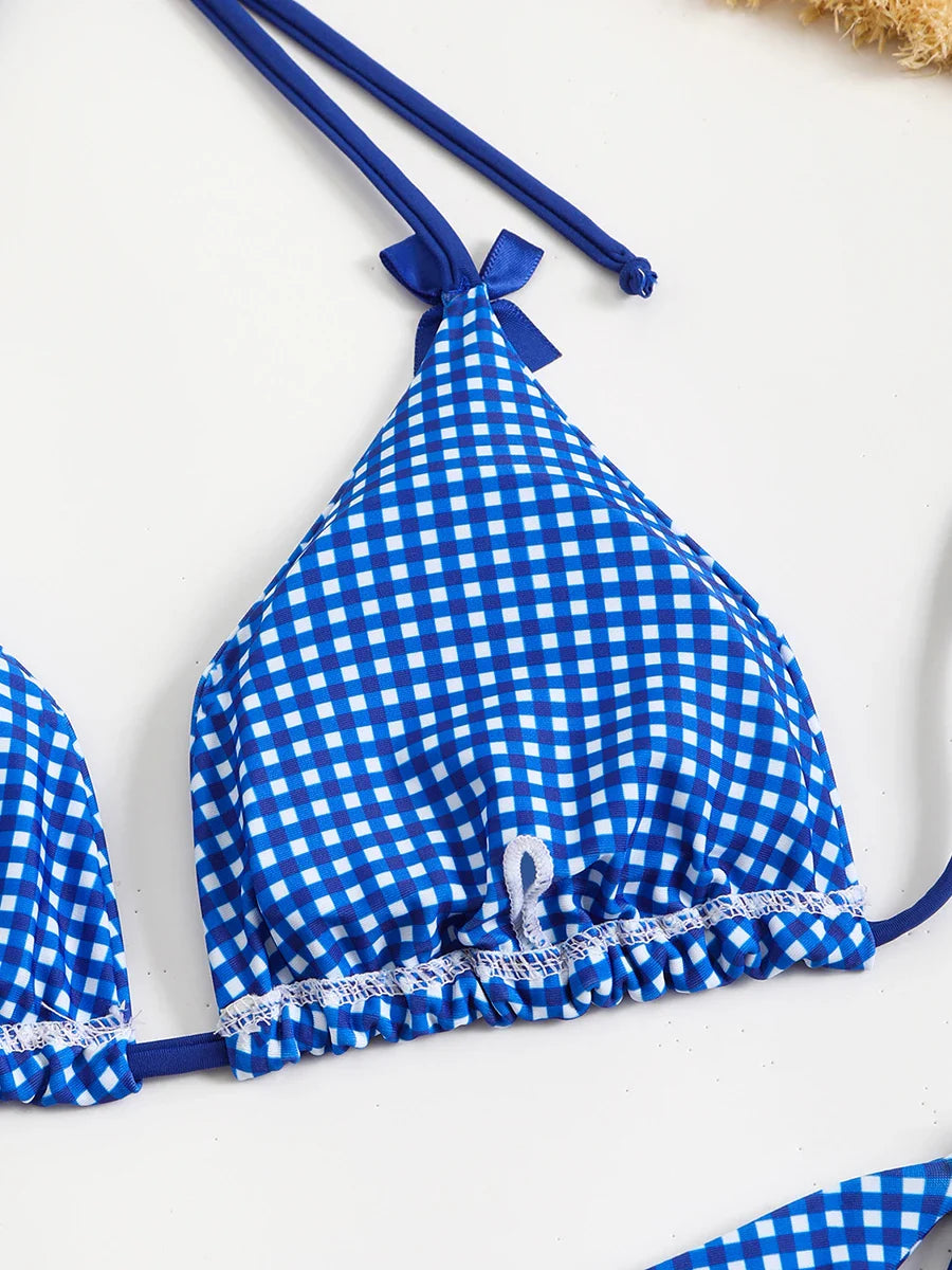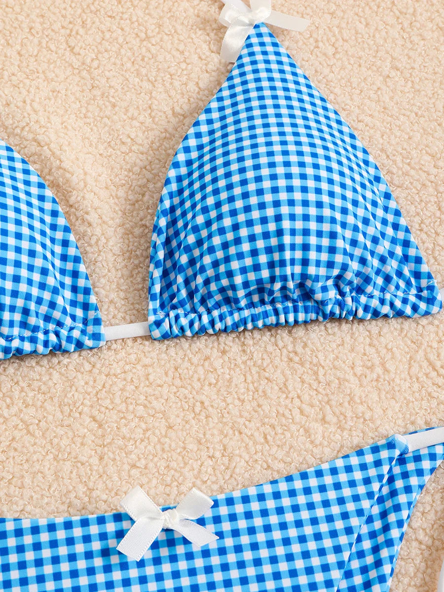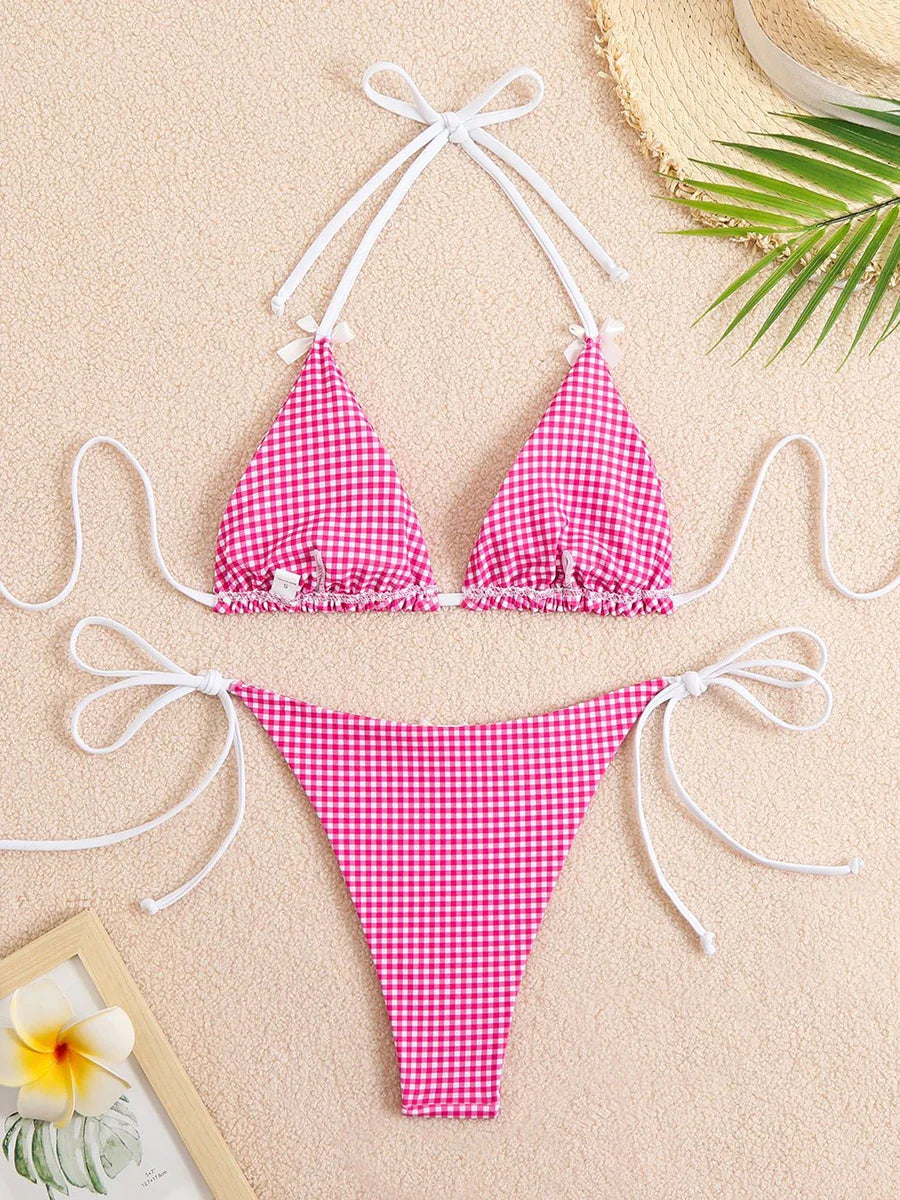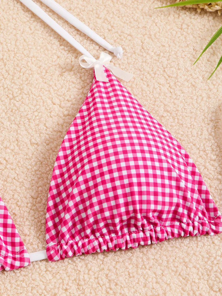 Checkered Halterneck Bikini with Butterfly Decoration