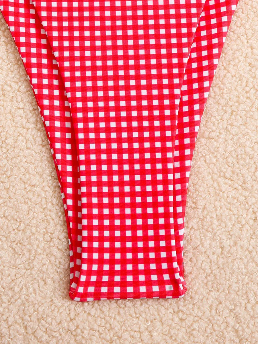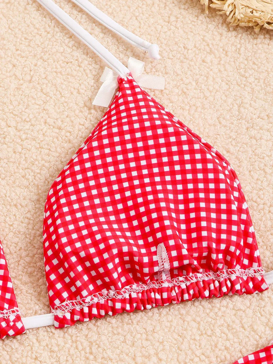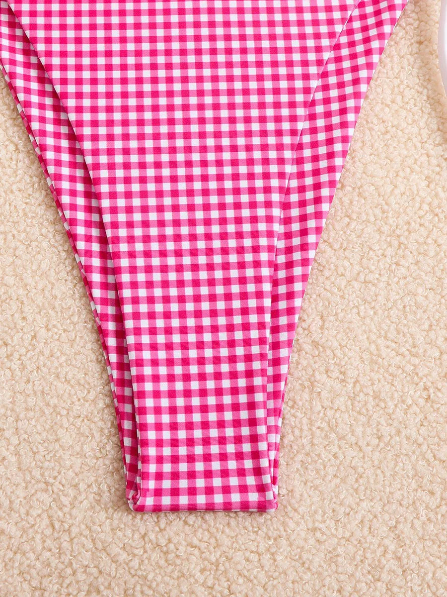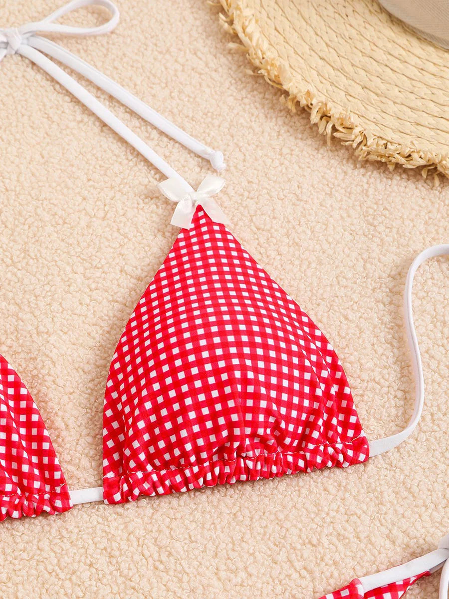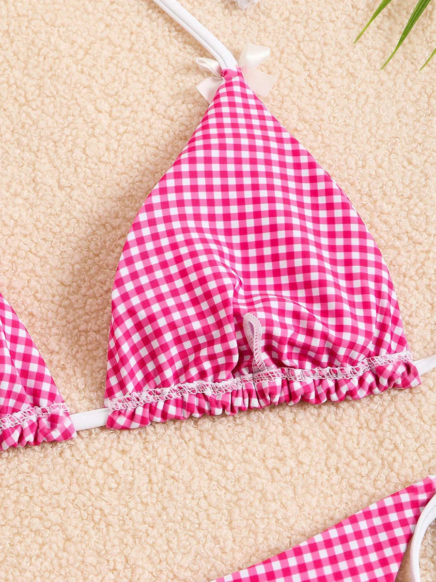 Checkered Halterneck Bikini with Butterfly Decoration